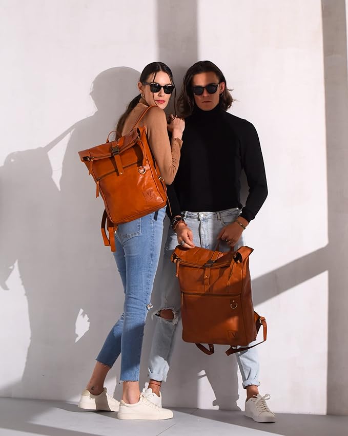 - SPACIOUS & STYLISH: This Leather bookbag sized 15,3"x10,6"x4" (LxWxH) is quite spacious & its storage volume is extendable as per your needs due to its roll-top design which makes it ideal for daily usage, short trips and outdoor activities.