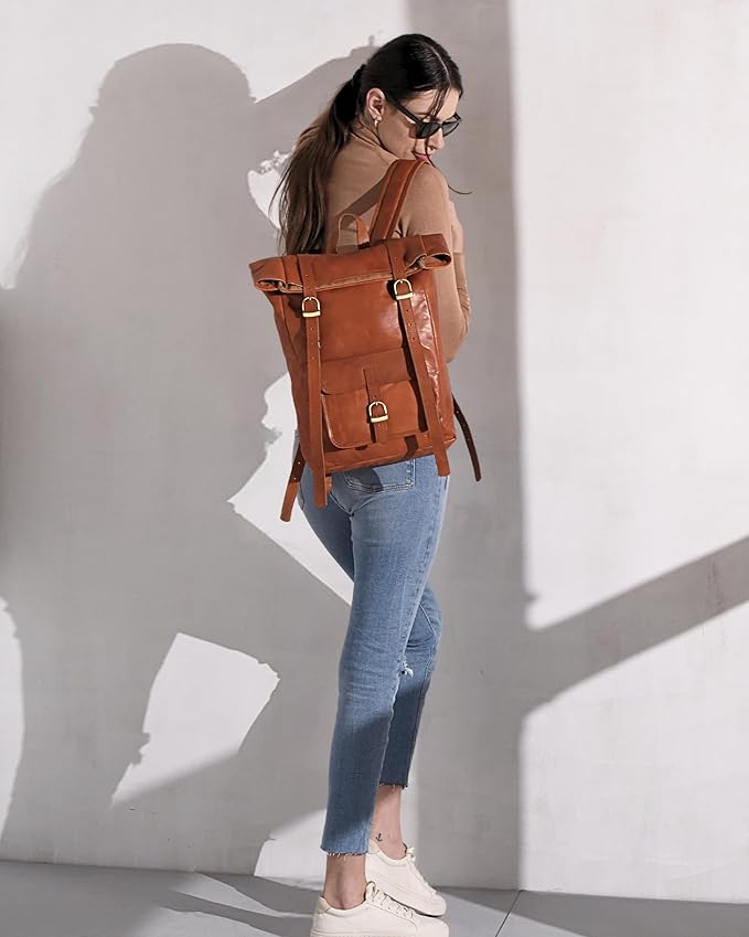 - SPACIOUS & STYLISH This Leather bookbag sized 15,3"x10,6"x4" (L x W x H) is quite spacious & its storage volume is extendable as per your needs due to its roll-top design which makes it ideal for daily usage, short trips and outdoor activities.