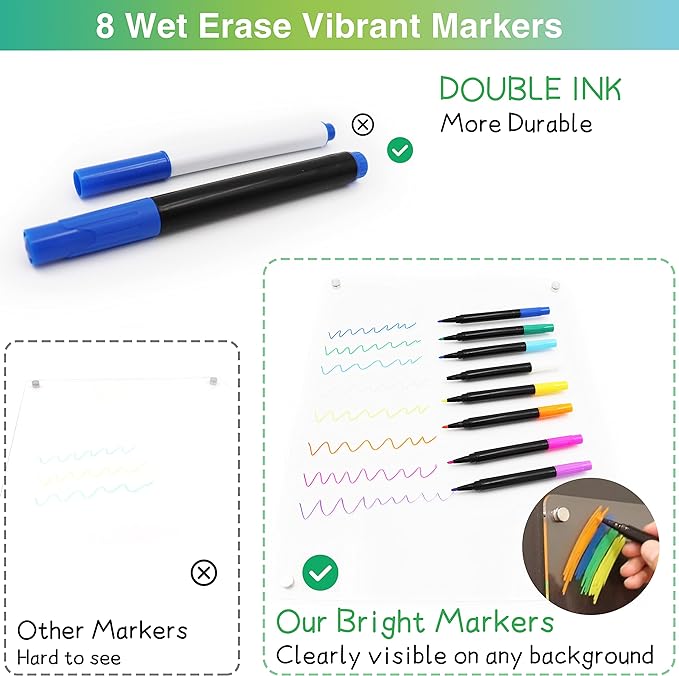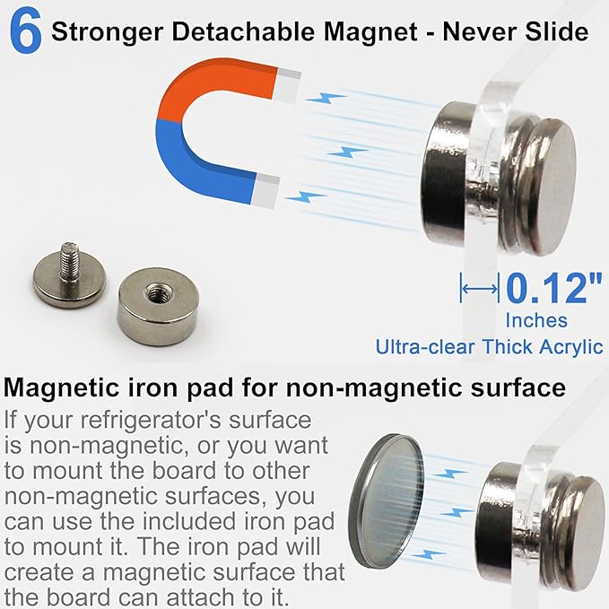 - [Enlarged & Easy to Clean, No Trace] The enlarged 16" x 12" stylish dry erase magnetic board allows you to write more. Our magnetic board for fridge is made of 0.12 inches clear thick acrylic, not easy to scratch and break. The acrylic white board surface is easy to clean and erase, you just use our cloth with water for complete cleaning. Your acrylic dry erase board for wall without leaving any stains or ghosting.