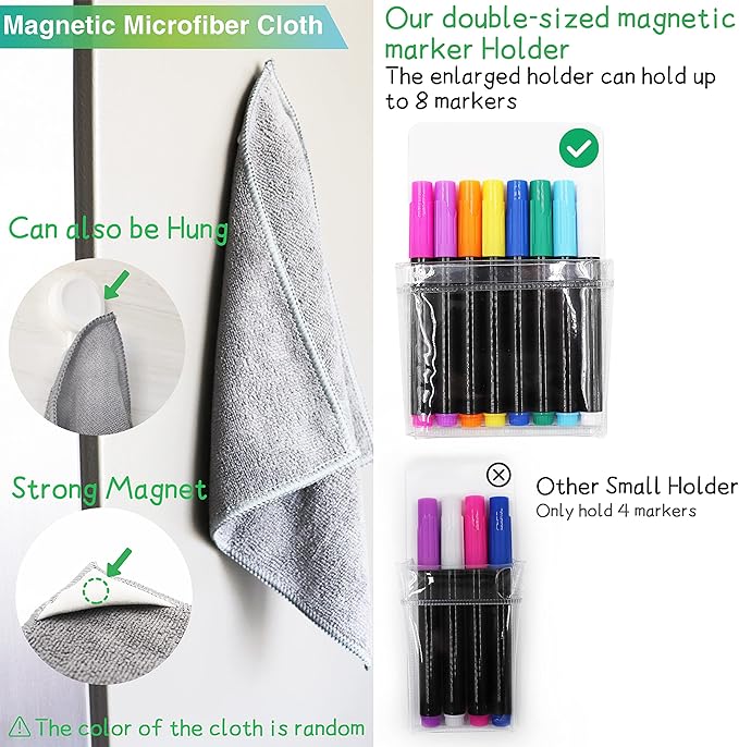 - [8 Wet Erase Neon Markers & 1 Magnetic Cleaning Cloth & 1 Magnetic Marker Holder] Microfiber cloth have strong magnet to ensure a strong hold to your fridge. The markers have double capacity ink. Vibrant & intense color can last long time. Our durable cloth are manufactured from microfiber and also supported for hanging use. The enlarged double-sized magnetic marker holder can hold up to 8 markers.