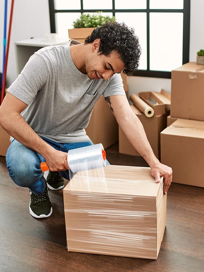 - 4-Pack Clear Stretch Wrap Film: Each 5" x 1000ft roll contains 2 rolling plastic handles. This mini moving wrapping plastic roll has industrial strength and durability, which ensures your valuables stay safe while in storage, moving, or during shipment.