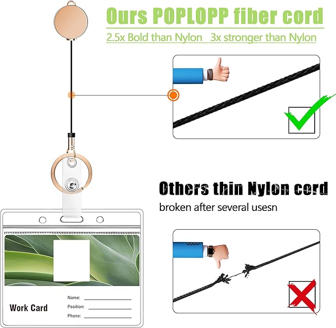 • 【Persistent Badge Reel & ​Key Ring】The badge reel and key ring is made of zinc alloy. will not fade or rust, nickel-free. The spring in the badge reel is made of stainless steel The retraction force is reliable, strong enough and strong enough to support most of the key's weight without slipping all the way . Built-in ultra-resistant fiber rope, 3x stronger than Nylon cord of generic badge reel so you never have to worry about them falling off