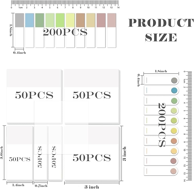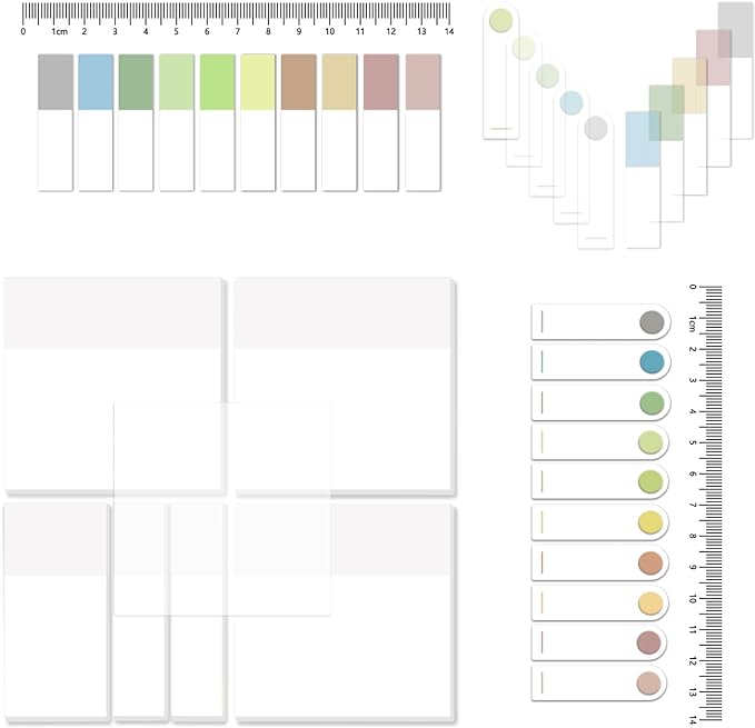 - What Will You Get: 150 Sheets transparent sticky notes( 3x3 inch ), 50 Sheets translucent sticky notes(3x1.4 inch), 100 Sheets translucent sticky notes(3x0.7 inch), 400 Sheets morandi pastel different colors book tabs(1.8x0.4 inch)