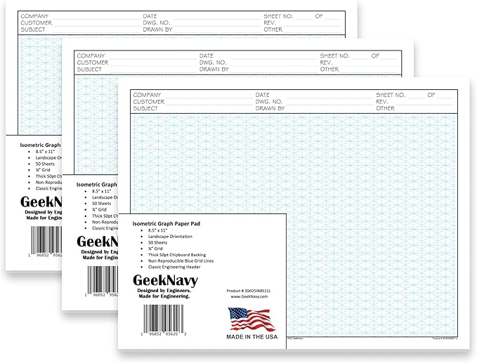 8.5" x 11" Isometric Graph Paper 50 Sheets Landscape - 0.25" Grid, Non-photo Blue, High Brightness, Drafting, Engineering, Art, 3D Design (3-Pack)