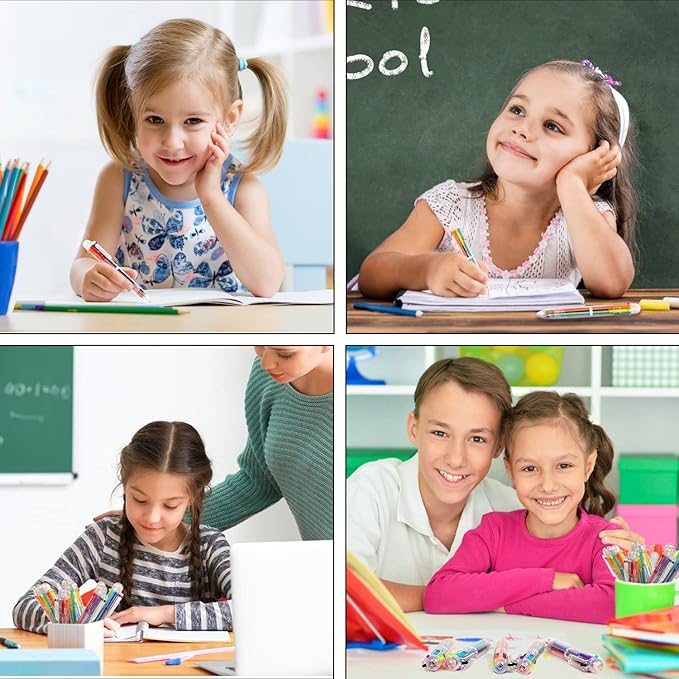 - 8 Colorful Ballpoint Pens: Contains 8 multicolor ballpoint pens in black, blue, red, orange, green, purple and clear barrel