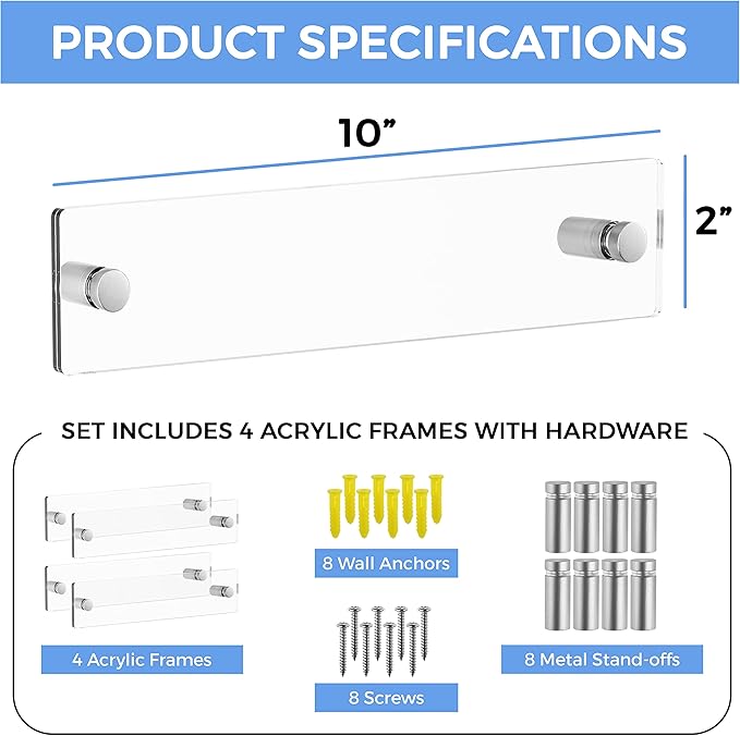 Set of 4 - Sturdy & Elegant Acrylic 2 Piece Wall Mount Name Plate Holder, Office Business Door Sign Holder with All Hardware Included, Card Inserts NOT Included, Inner Size, 8” x 2”