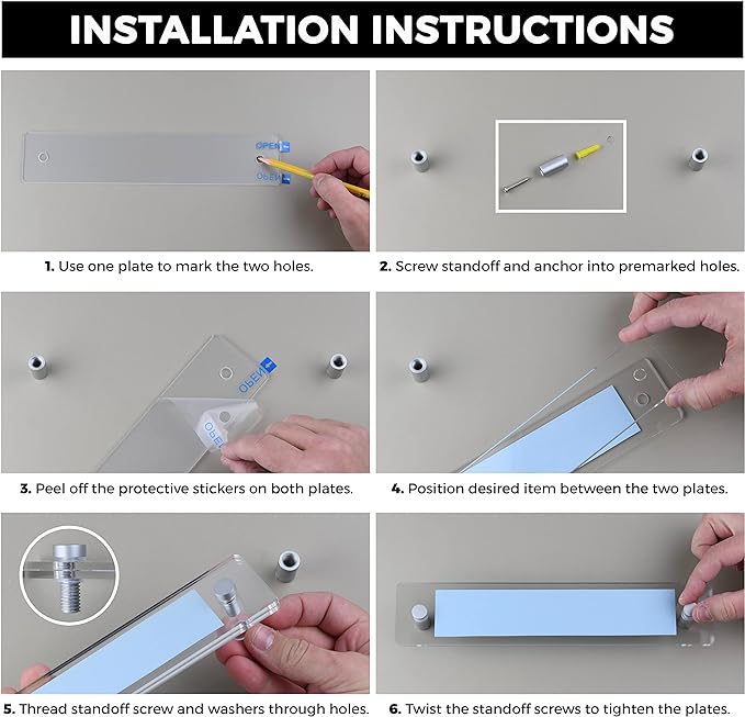 - Hardware Included – Standoff Mounts, Size of Caps Diameter ½”, Screws, Anchors and Washers, Instruction Sheet - Card Inserts NOT Included.