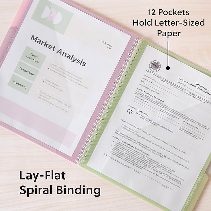 - PRACTICAL DESIGN: The slash pockets can hold up to 25 sheets each; the spiral-bound design allows the office supply organizer to lay flat for convenience and rotate 360° for easy viewing; tear-resistant and water-resistant poly cover material ensures long-lasting durability