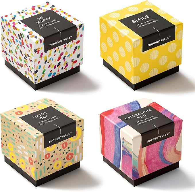 - THEME – SHARE SUNSHINE: Included in this pack are 4 boxes of ThoughtFulls - 1 box of Celebrating You, 1 box of Be Happy, 1 box of Happy Day, and 1 box of Smile. Every box features 30 cards, each with a unique quote to connect with joy. Share with a friend, family member, coworker, or anyone who could use an extra dose of good feelings.