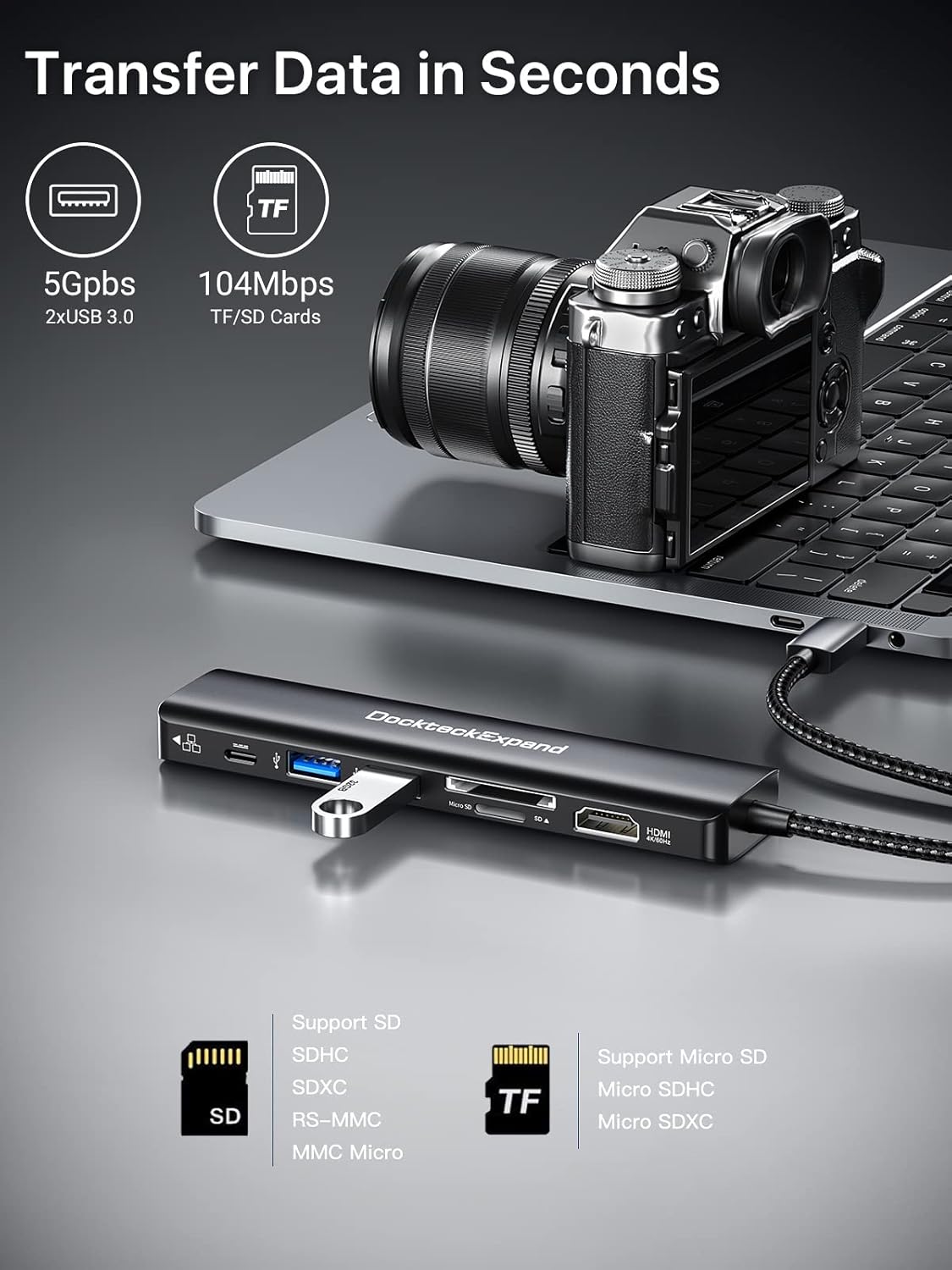 - SD/TF Storage Expansion & Fast Transmission:TF /SD card slots can be used simultaneously, reading speed up to 104MB/s. Support different memory card formats such as SD, SDHC, Micro SD, MMC, SDXC. 2 USB 3.0 data ports are primed to transfer large files up to 5Gbps, down compatible with USB A 2.0 and below
