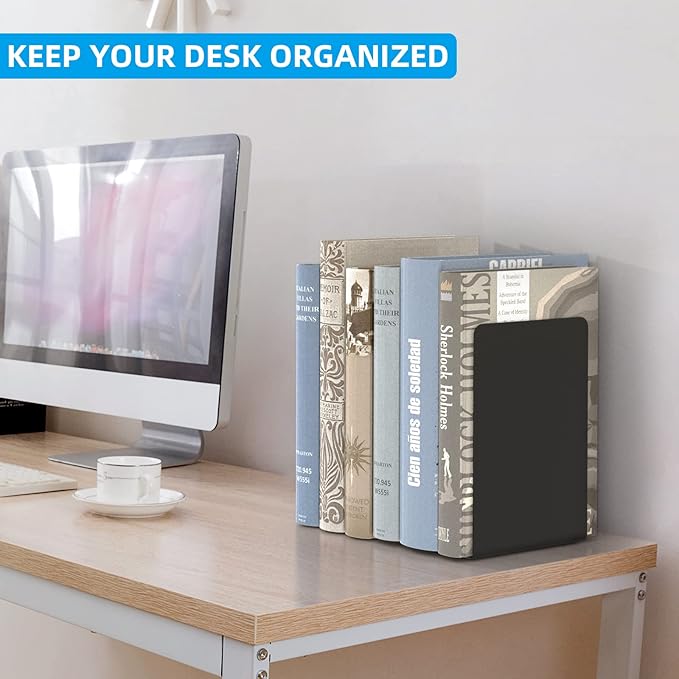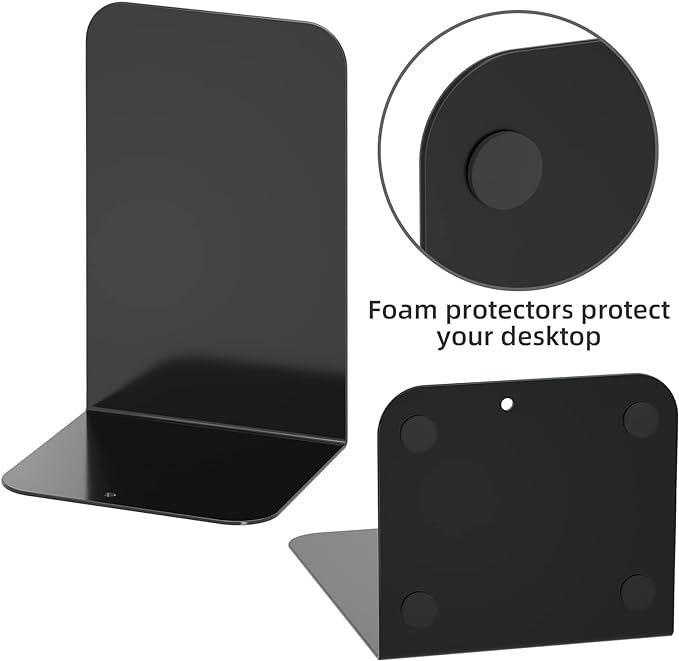 - Stable and Anti-Slip -- The bottom of each bookend has 4 premium non-slip pads, make bookends stand more stable on desktop or bookshelf, prevent the book stopper sliding and avoiding scratches on surface of desktop or bookshelf.