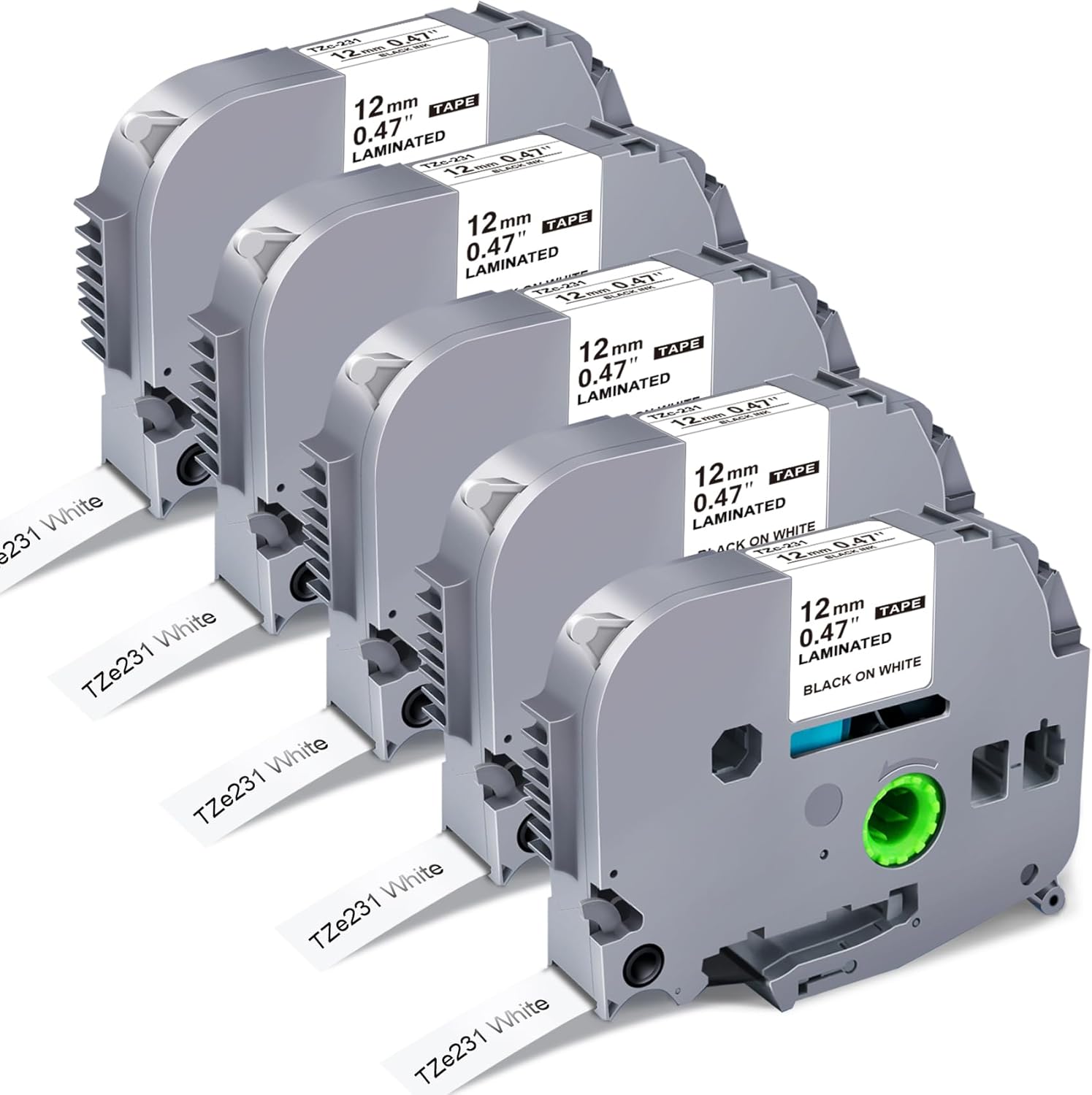 - Package Includes: 5 Pack P Touch Label Tape 12mm TZe-231 TZe 231 TZ-231 TZC-231 Tape; Dimensions: Width- 1/2 inch (12mm 0.47 inch), Length- 26.2 feet (8 meter), Color: Black on White Label Maker Tape; NON-OEM tape