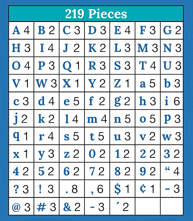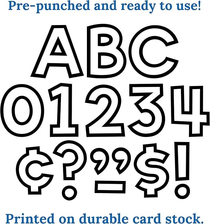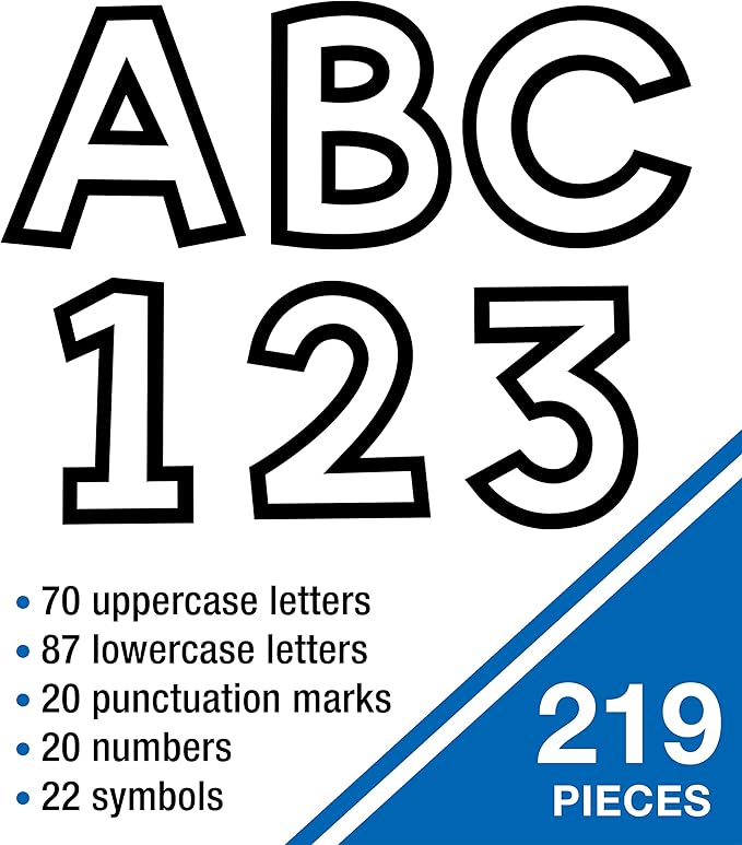 - What’s Included: This 219-piece set includes 70 pre-punched uppercase and 87 lowercase alphabet letters, 20 numbers, 22 symbols, and 20 punctuation bulletin board decorations in a white design with sleek, black trim.
