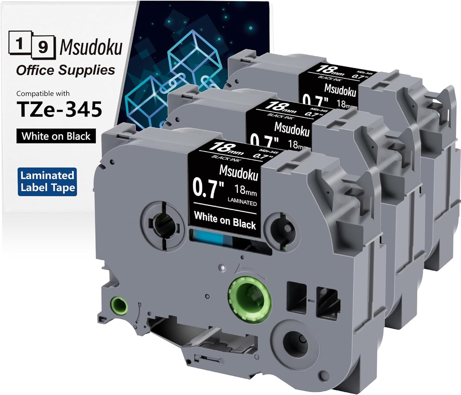 - These compatible for brother label maker tape 18mm 0.7 TZe-345 TZe345 have strong adhesive and no sticky residue when you remove it. The split back design of ptouch label tape 18mm black tape is very easy to peel off