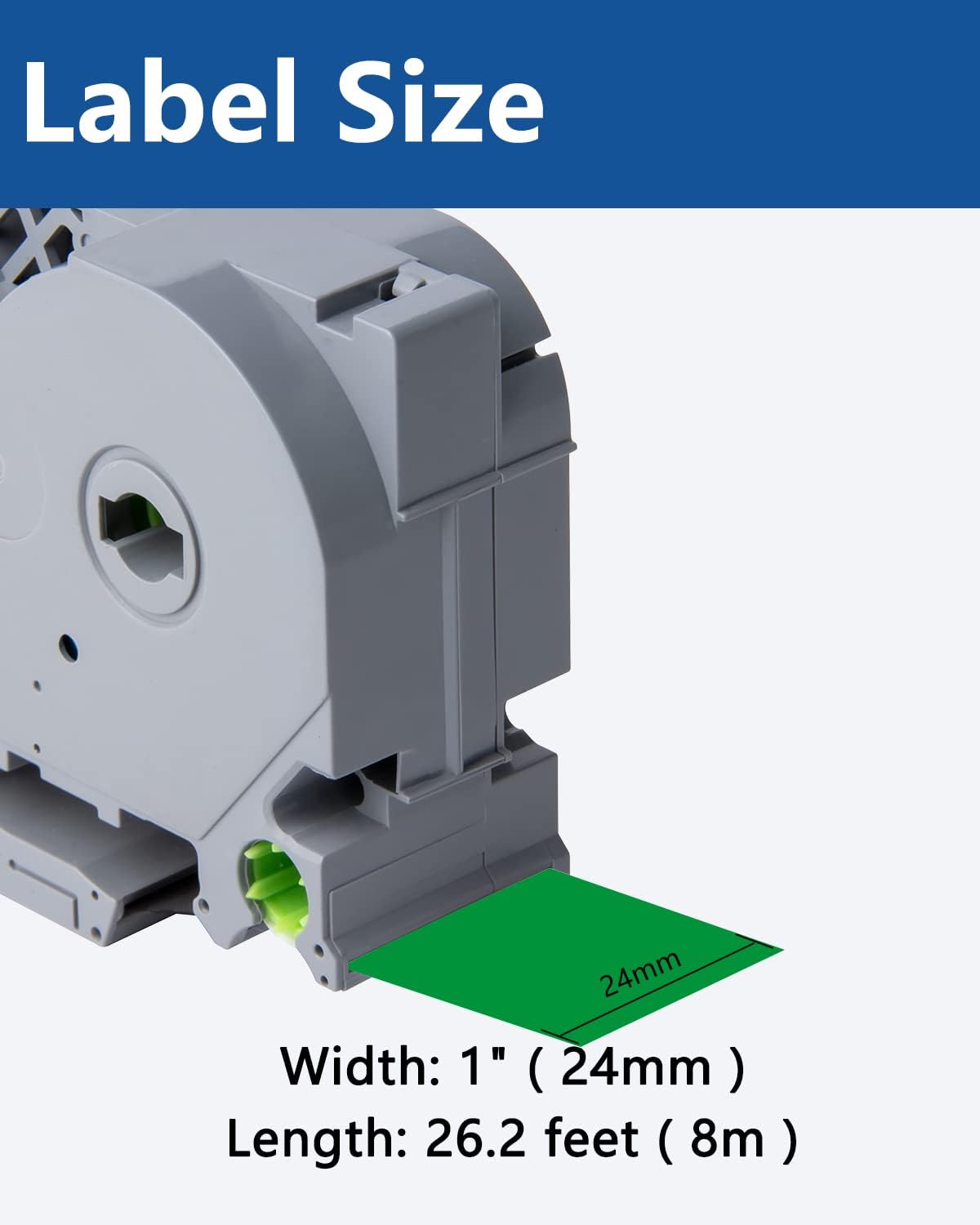 - Size - 0.94" width x 26.2' length ( 24mm x 8m ) each 24mm label maker tape. Color - Black ink on green tape