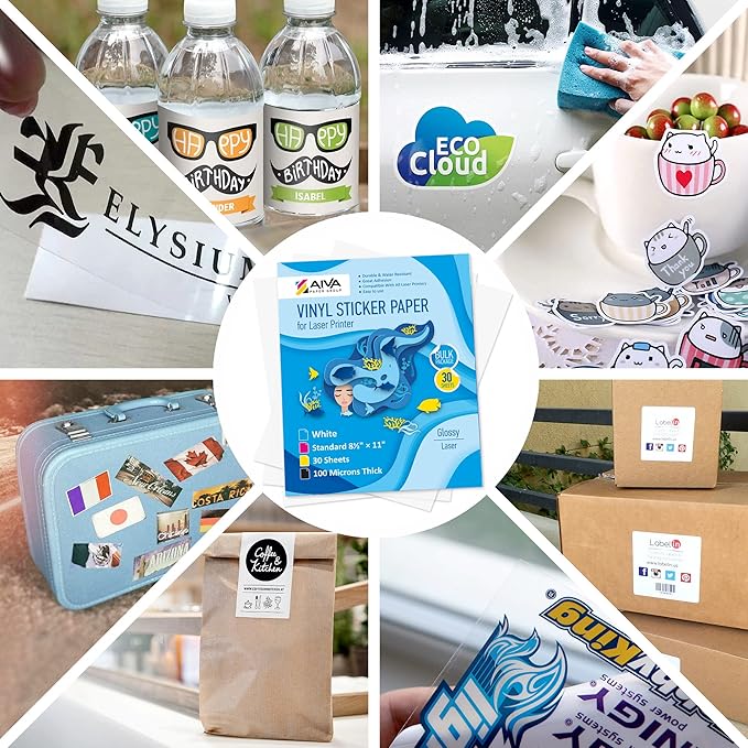 - High-Quality Printable Vinyl Paper - set includes 30 white vinyl sheets of Printable Sticker Paper for laser printer, Glossy finish. US Standard Letter Size - 8.5"x11". Suitable for High resolution and clear image quality