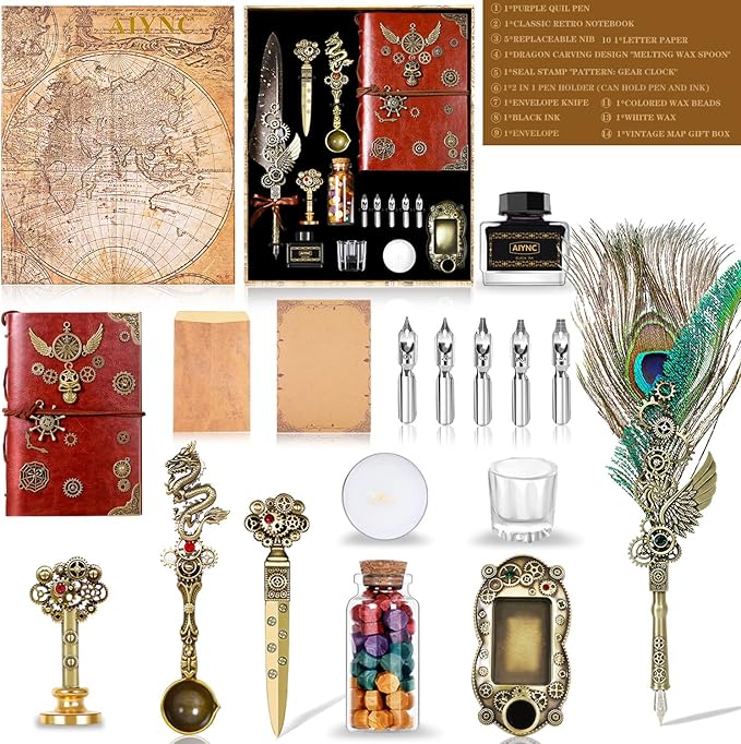 - 【Quill Pen Ink Set Included】: 1* Quill Pen, 1* Notebook, 1* Ink(Black), 1* Seal Stamp, 1* Pen Holder, 5* Stainless Steel Nibs Of Different Sizes, 1* Wax Beads, 1* White Wax, 1* Spoon, 1* Cup, 1*1 Envelope Opening Tool, 1* Envelope and writing paper, 1*Beautiful Vintage Globe Design Box.The unique and beautiful punk mechanical gear design is a beautiful landscape no matter it is placed on the desk, coffee table or computer desk.