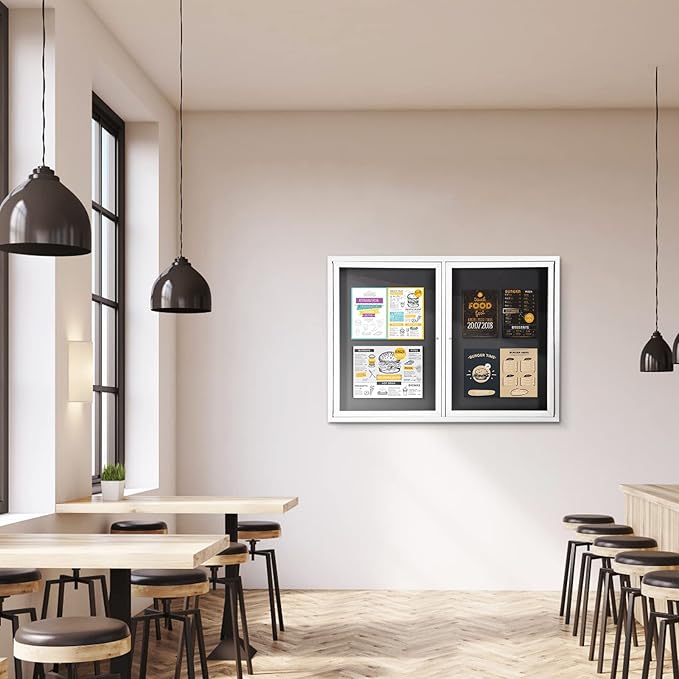 - 💧OUTDOOR USE —The weather-resistant cabinet construction features an aluminum frame with a smooth surface and full-length piano hinges that add strength and durability to the door frame. Drain holes on the bottom and a sealed backing mean you can mount the board outdoors.