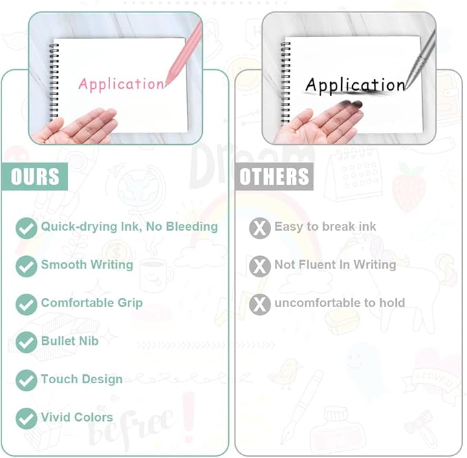 - 【SMOOTH WRITING & DRAWING】Our gel ink pens write smoothly and consistently with fine point 0.5mm vivid different colored ink. 0.5mm medium point with premium ink delivers skip-free glides all the time, which allows you write, notetaking and drawing for a long time without interruption.
