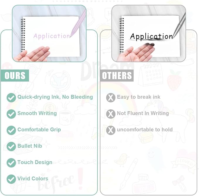 - 【SMOOTH WRITING & DRAWING】Our gel ink pens write smoothly and consistently with fine point 0.5mm vivid different colored ink. 0.5mm medium point with premium ink delivers skip-free glides all the time, which allows you write, notetaking and drawing for a long time without interruption.