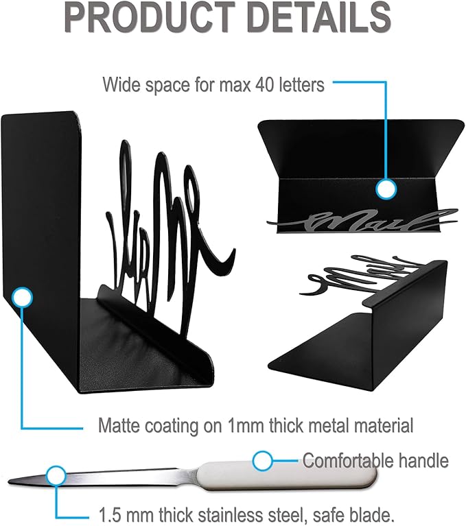 - 5. What you get: A matte black mail holder + A stainless steel letter opener with white handle.our worry-free 12-month warranty, and friendly customer service.