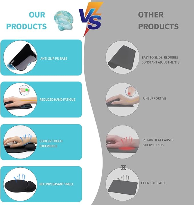 - 🟢【Ergonomic Design】Gel mouse wrist pad are designed with ergonomics in mind, providing a natural and comfortable posture for your wrist. This can help prevent long-term injuries like carpal tunnel syndrome and other repetitive strain injuries, ensuring that you can use your computer for longer periods with ease.
