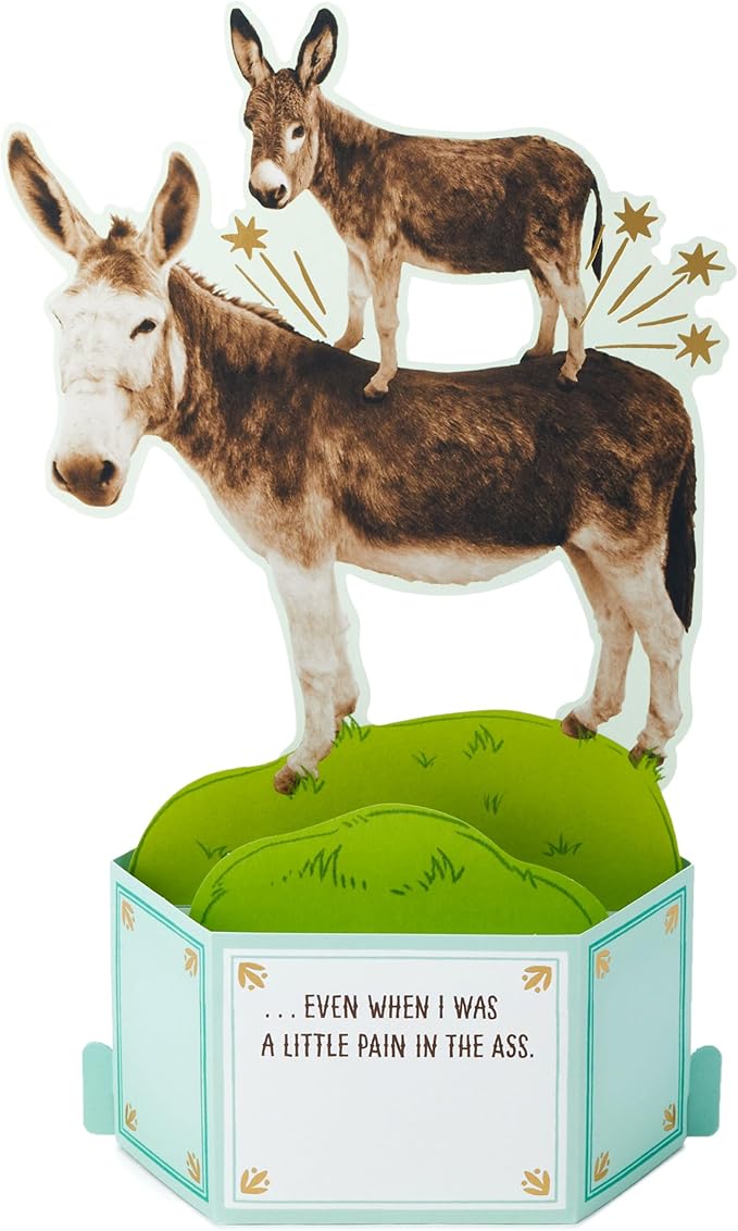 - Funny pop-up greeting card features a cute duo of three-dimensional, laser-cut donkeys paired with a humorous message of gratitude perfect for Father's Day, Mother's Day, birthdays and more.