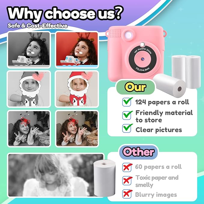 - Safe Print Paper:The material of this children's camera printing paper is safe, without toner, odorless and non-toxic, which is safer and more comfortable for children's skin.It is no BPA