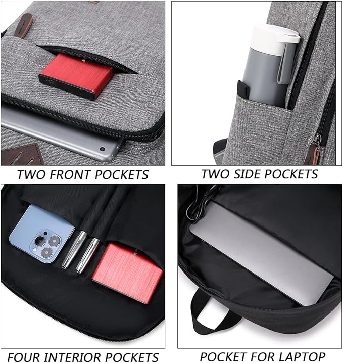 - 11 POCKETS: 1 main compartment, 2 side pockets, 2 front pockets, 1 padded laptop compartment, 1 inner zippered pocket and 4 open inner pockets for pens, portable charger, key, phone, or so on.