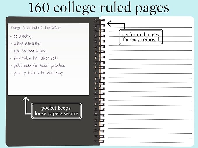 - INCLUDES 160 PAGES: Spiral notebook includes 160 high-quality, lined pages that withstand ink bleed-through; pages feature college ruled lines with a perforated edge to easily take to-dos, notes, and reminders on-the-go
