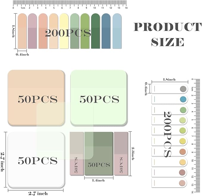 - What Will You Get: 150 Sheets transparent sticky notes( 3x3 inch ), 50 Sheets green translucent sticky notes(2.3x1.45 inch), 100 Sheets pink translucent sticky notes(2.3x0.7 inch), 400 Sheets morandi different colors book tabs(1.8x0.4 inch)