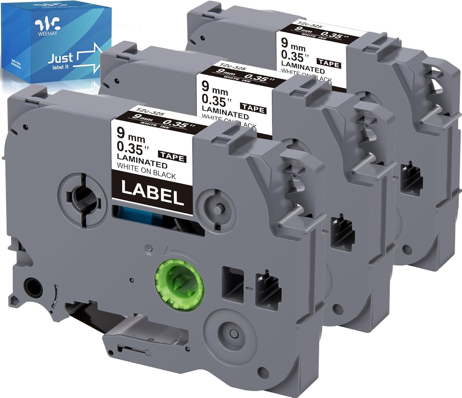 Weemay 3 Pack TZe-325 Compatible for Brother P-Touch Label Tape 9mm 0.35 White on Black TZe TZ Tape TZ-325 TZ325 TZe325 3/8 Label for PTouch PTD210 PTD220 PTH110BP PTD410 PTD600 Printer