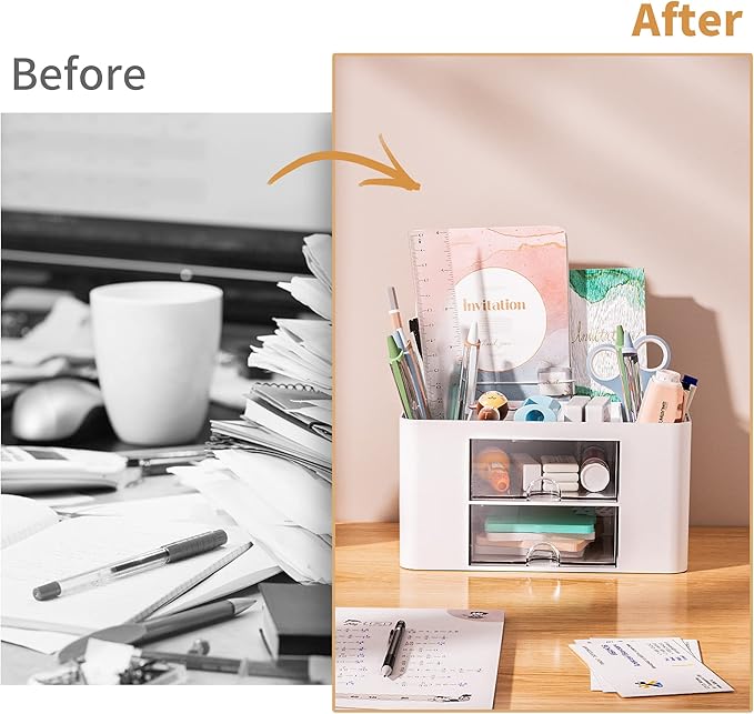 - 【Convenient And Multifuction】This Desk Caddy is no installation required not only perfect for storing your desktop stationery and many other desk widgets but also great for storing your makeup brushes, nail polishes, lipsticks, and other small personal items sorted by type. The transparent drawer makes it way easier to find what you need! and You can put any other daily necessities on the organizer, It helps you keep your stuff organized