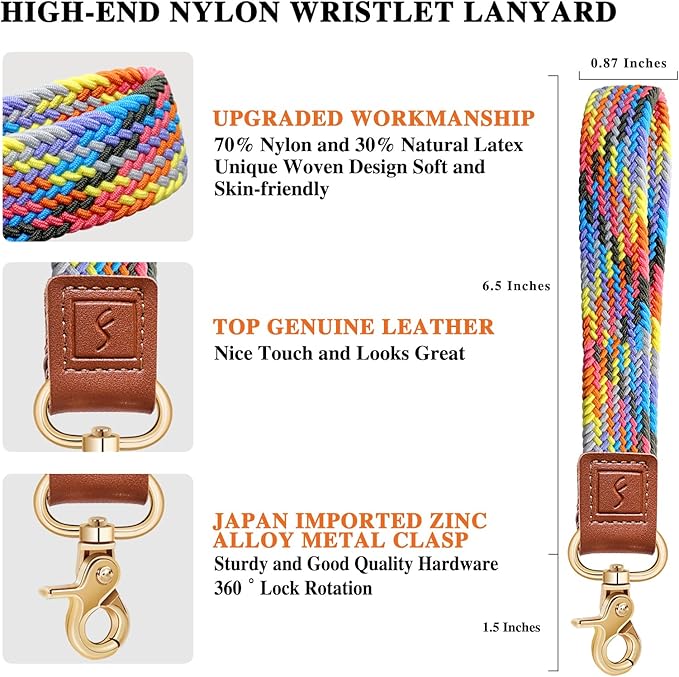 - Upgraded Stretchy Design: Fishent wrist lanyard is roughly 0.87 inches width and 6.5 inches length from the bottom of the leather to the top of the wrist key loop, with super-soft weave strap(stretchy), genuine leather and quality metal wristband keyring clasp lanyards for keys. The hand wrist lanyards keychain adopt unique upgraded stretchy nylon design, the wrist strap is soft and textured. Comfortable to wear and not easily deformed