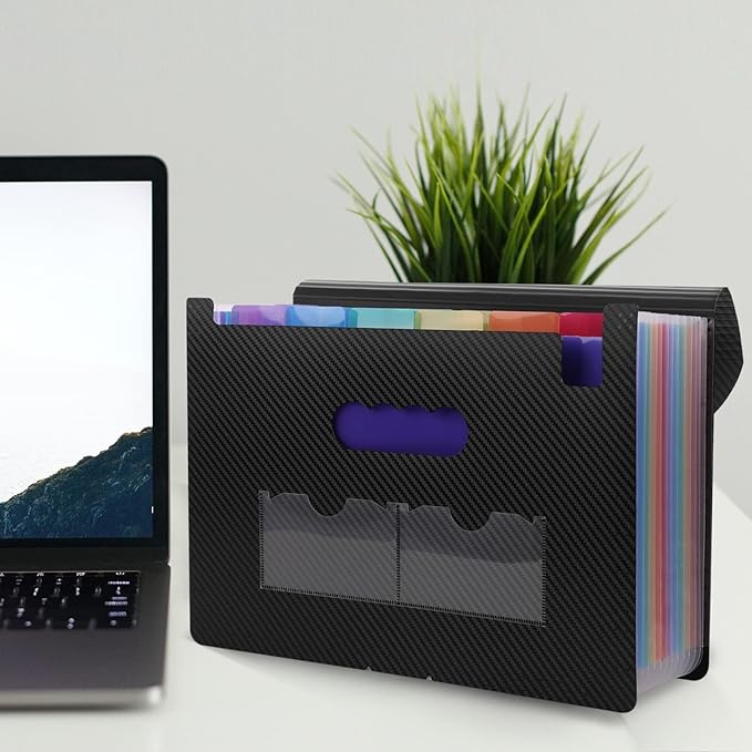SKYDUE Accordion File Organizer, 12 Pockets File Folders, Letter Size Expanding File Folder with Colored Tabs and Expandable Cover, Portable Bill Receipt Organizer Black