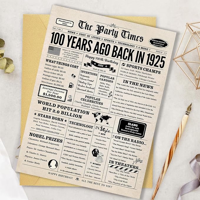 100th Birthday Card, 100th Birthday Decorations for Men Women, 100th Birthday Gifts for Grandma Grandpa, Back in 1925 Birthday Card