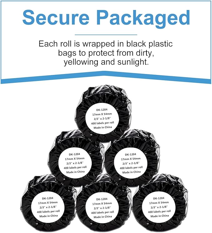 - All the characteristics you are looking for: 0.66 x 2.1 inch (17mm x 54mm) multi-purpose labels replace for brother DK-1204 will crystal clear print, strong adhesive make sure it doesn’t peel off easily. Resistant scratches and smudges. Every roll label in black poly bag for protection and storage