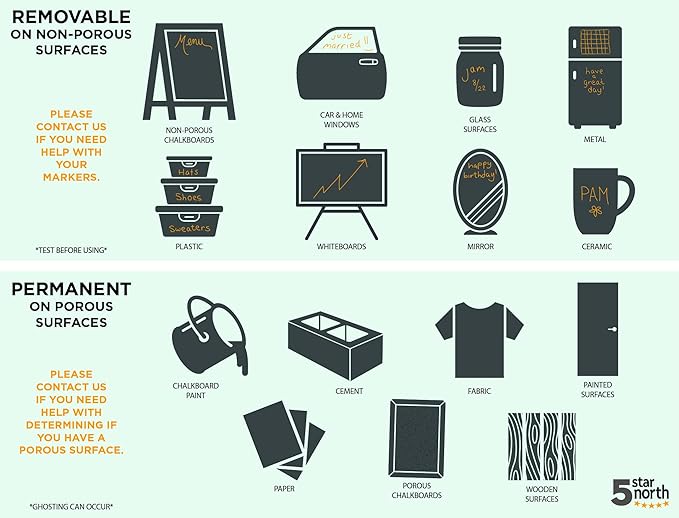 - IMPORTANT! - NEVER use any chalk markers on chalkboard paint or low-quality porous chalkboards. Test in a corner first. WRITE ON ANY PRIMED CHALKBOARD, GLASS OR OTHER NON POROUS SURFACE. These chalkboard markers also make great window markers and dry erase markers! Use these chalk markers for glass, tile, contact paper, stickers, whiteboards, plastic, and metal with ease. The bright liquid chalk is sure to please.