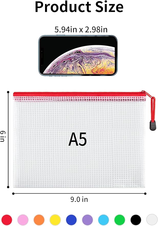 - 30Pcs ZIPPER BAGS: The package comes in 30pcs A5 (6x9 inches) mesh zipper pouches. An ideal assistant to help you organize and store at school, office, or home.
