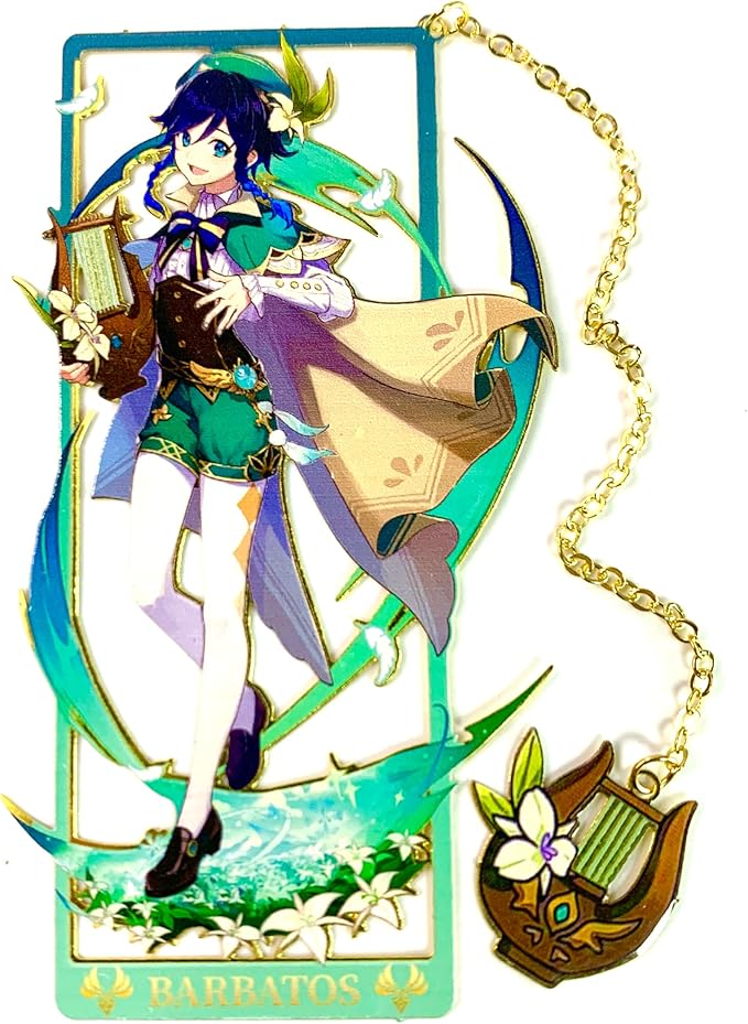 - Immerse yourself in the world of Genshin Impact with these stunning Barbatos brass bookmarks, featuring a Quadratic element design inspired by the beloved anime game.