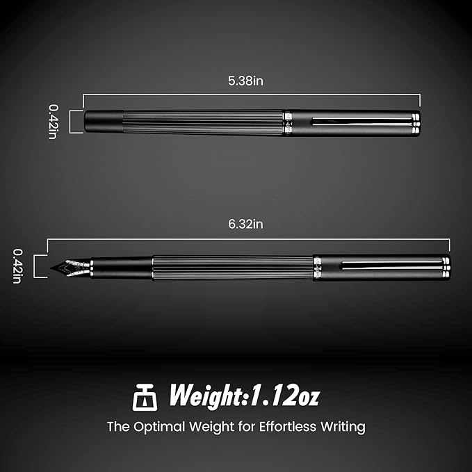 - Appearance & Quality: This refillable fountain pen has an exquisite metal body with a matte black finish. It is well made, sturdy and durable. Perfect metal weight and balance for premium feel in your hand.