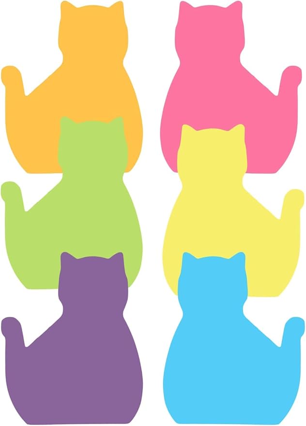 - 24 pack of cat sticky notes. 120 Sheets YELLOW + 120 Sheets PINK BLUE + 120 Sheets GREEN + 120 Sheets PURPLE + 120 Sheets ORANGE