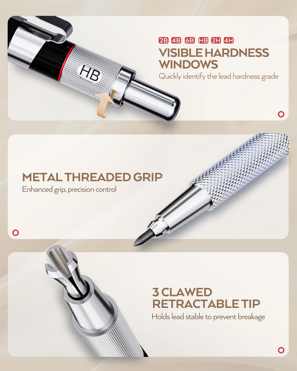 - Two Type Anti-Slip Grips: Rhombus textured rubber grips and metal threaded anti-skidding, these pencils adopt different grip design base on pencil weight and applicable scene, only for better experience