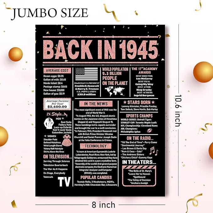 80th Birthday Card, 80th Birthday Decorations for Women, 80th Birthday Gifts for Mom, Back in 1945 Birthday Card, Rose Gold