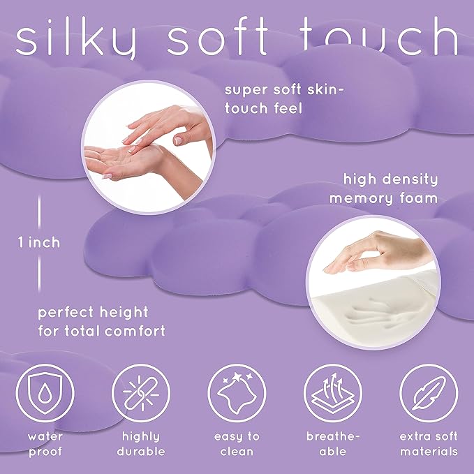 - CLOUD SOFT COMFORT - A premium high density memory foam cloud wrist pad arm rest for keyboard with a new soft-touch breathable material that is ultra comfortable against your skin. This cute and squishy cloud keyboard pad with wrist support is durable and contoured perfectly for you. A keyboard hand rest that is the perfect gaming keyboard wrist rest with wrist support for keyboard rest wrist pad. A super comfy desk wrist rest cloud desk pad