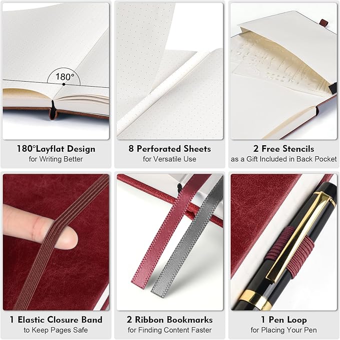 - 【User-Centered Design】❶ Add 2 subtle markers on the pages to assist with QUICK PAGE LAYOUT, allowing you to easily locate the center of rows and columns without counting every time; ❷ Include all the essential features of a perfect dot grid journal, such as 8 perforated sheets, 2 bookmarks, elastic closure band, pen holder, and back pocket; ❸ BONUS - 2 stencils are being gifted to you to create your ideal bullet point journal.