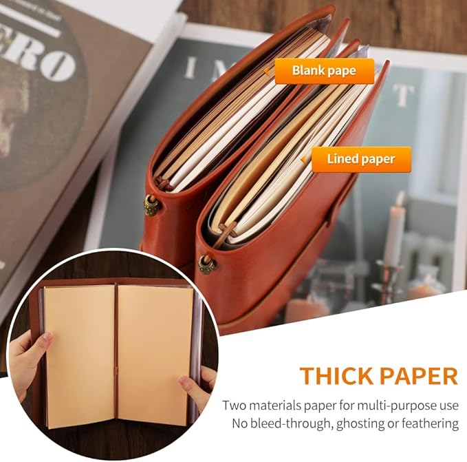 - 【Refillable Design】There are two different papers in the diary, liner + kraft paper, a total of 140 pages. Includes PVC card slot and a pouch inside. The double-line binding design allows the paper inside to be replaced at will, increasing reusability. A stretchy leather cord secures the entirety of the notebook on the outside of the notepad.