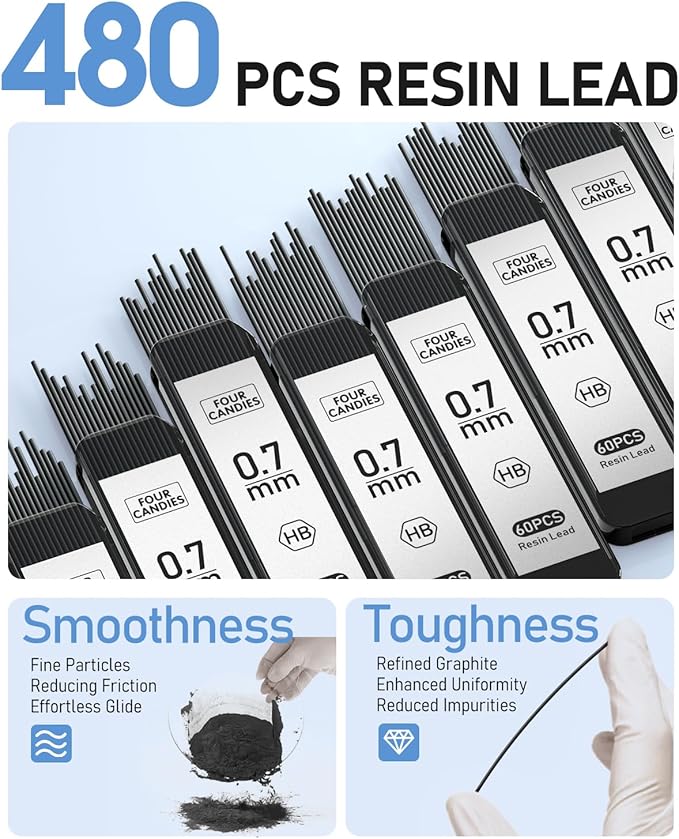 - 480PCS Resin Lead: 8 tubes of 60pcs super capacity leads. A more durable resin lead which doesn’t require sharpening and is not easy to break at the tip or break in the shaft, provides ultra-smooth writing and clear dark lines.