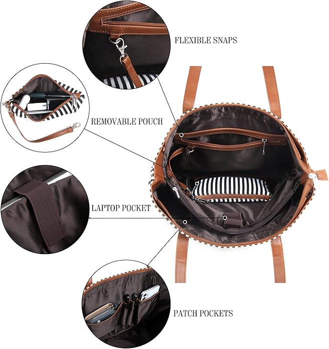 - Simple perfect design:The outer structure is subtle with a striped pattern and textured leather. Easy to open with a smooth sturdy metal zipper. The metal feet protect the bag from damage.Can be your handbag ladies large, conference work bag, ladies carry bag.