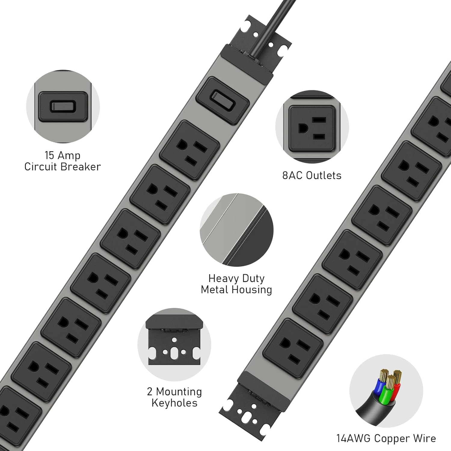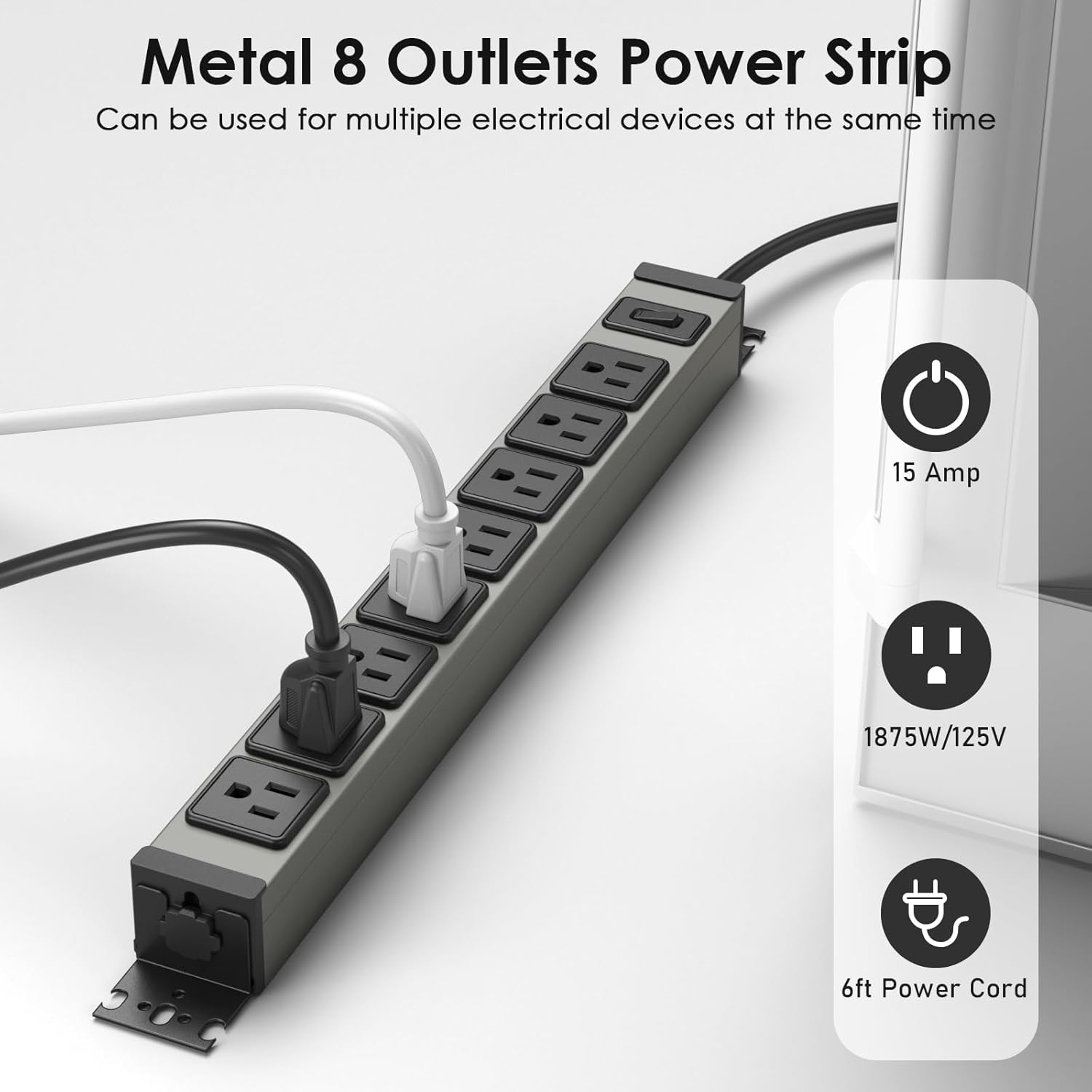 - Heavy Duty Power Strip 8 Outlet: Made of rugged metal shell that offers great impact resistant performance, high wear resistance heavy duty power cord protects circuits from fire, impact or rust, and prevents dents and scratches.
